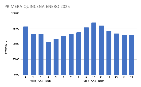 Comparado con las temporadas anteriores, el comportamiento de la demanda indica una evolución positiva frente a enero de 2024, cuando la primera quincena promedió alrededor del 50 % de ocupación y los picos no superaron el 65 % durante los fines de semana. En tanto, en enero de 2025 la misma quincena ya mostraba un promedio del 65% con tendencia de crecimiento hacia el final de este período y picos superiores al 70 % impulsados por reservas de último momento.
